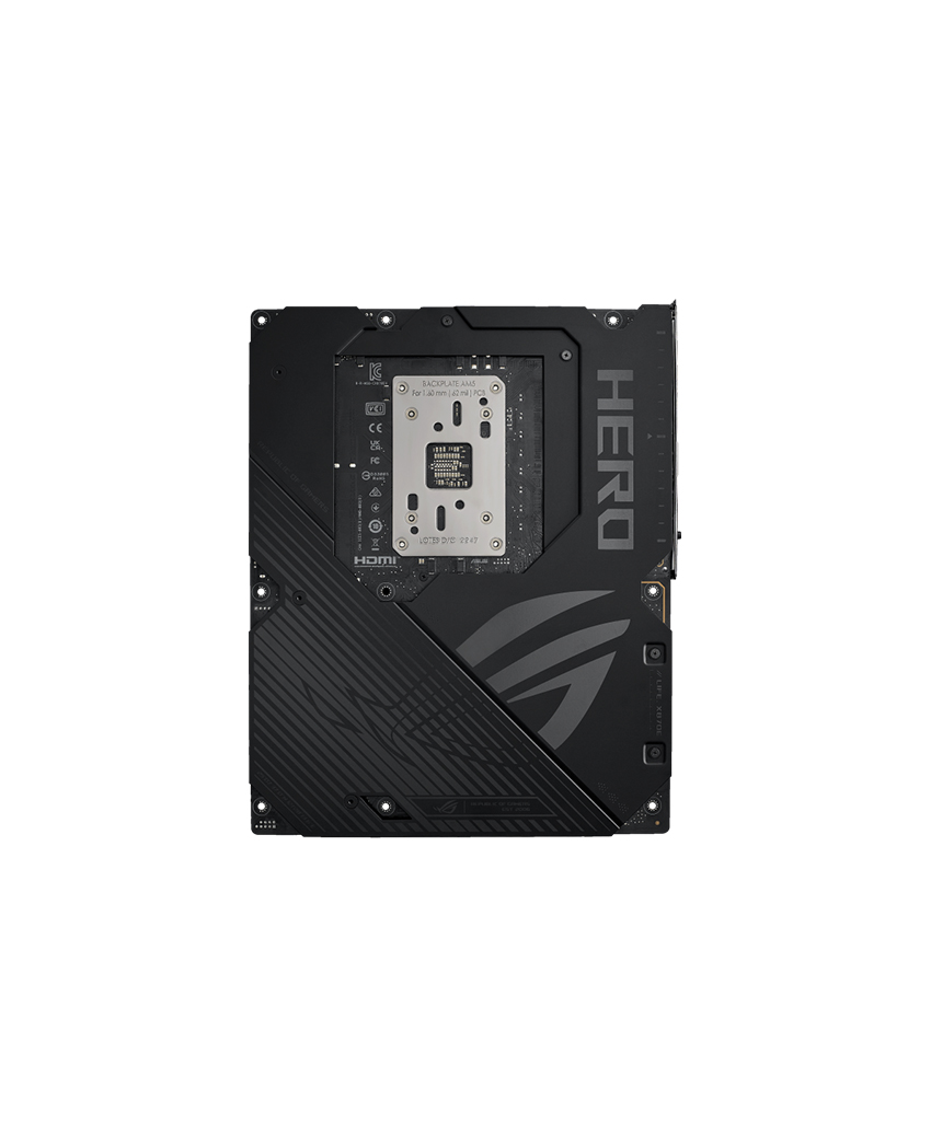 The AI PC-ready ROG Crosshair X870E Hero offers unyielding power delivery, robust thermal management, hyperspeed connectivity, comprehensive PCIE 5.0 and DDR5 support to unleash the performance of AMD Ryzen™ 9000 Series processors. Dark hues predominate across this motherboard, drawing your attention to premium metallic textures, nickel-plated surfaces, sleek contours and a stereoscopic visual effect on the large M.2 and chipset heatsink. This board also features the Polymo Lighting II effect. This upgraded lighting module built into the I/O shroud provides more dynamic RGB illumination for the signature ROG logo.